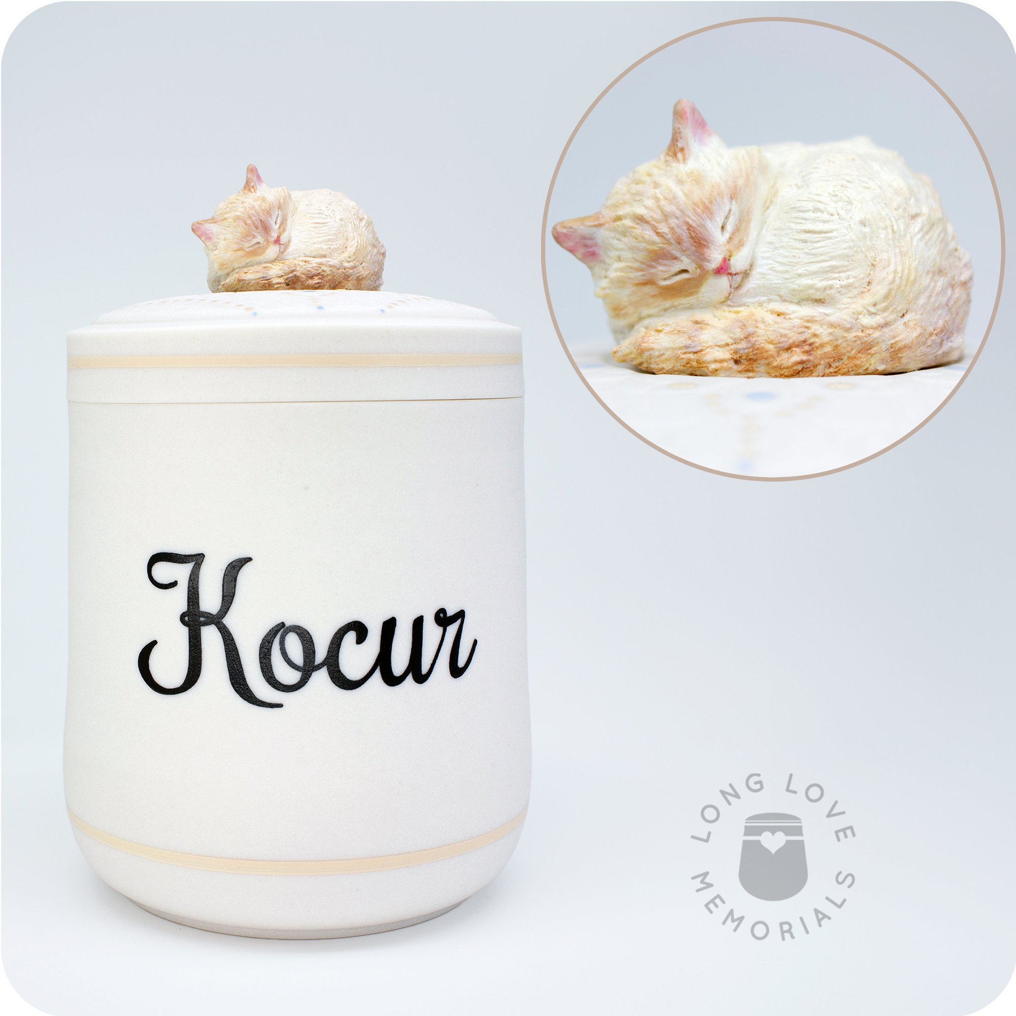 • Modern handmade cat urns include: porcelain jar and removable lid, and satin bag.